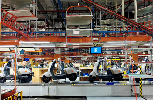 在雅迪科技集团无锡基地的生产线上,电机装配、前轮装配等流程有条不紊地进行;产线上方,电子看板实时更新数据,目标产能、总检未通过数等生产数据一目了然,为调整生产进度、把控产品质量提供精准依据。