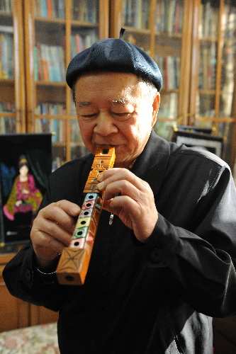 陈自明为记者示范演奏安第斯高原印第安人竹笛。 图/王凯