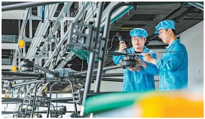 7月30日,在安徽马鞍山市花山区东华云计算产业园,安徽泓景无人机科技有限公司无人机装配调试人员对无人机进行总装总调。王文生摄(人民视觉)