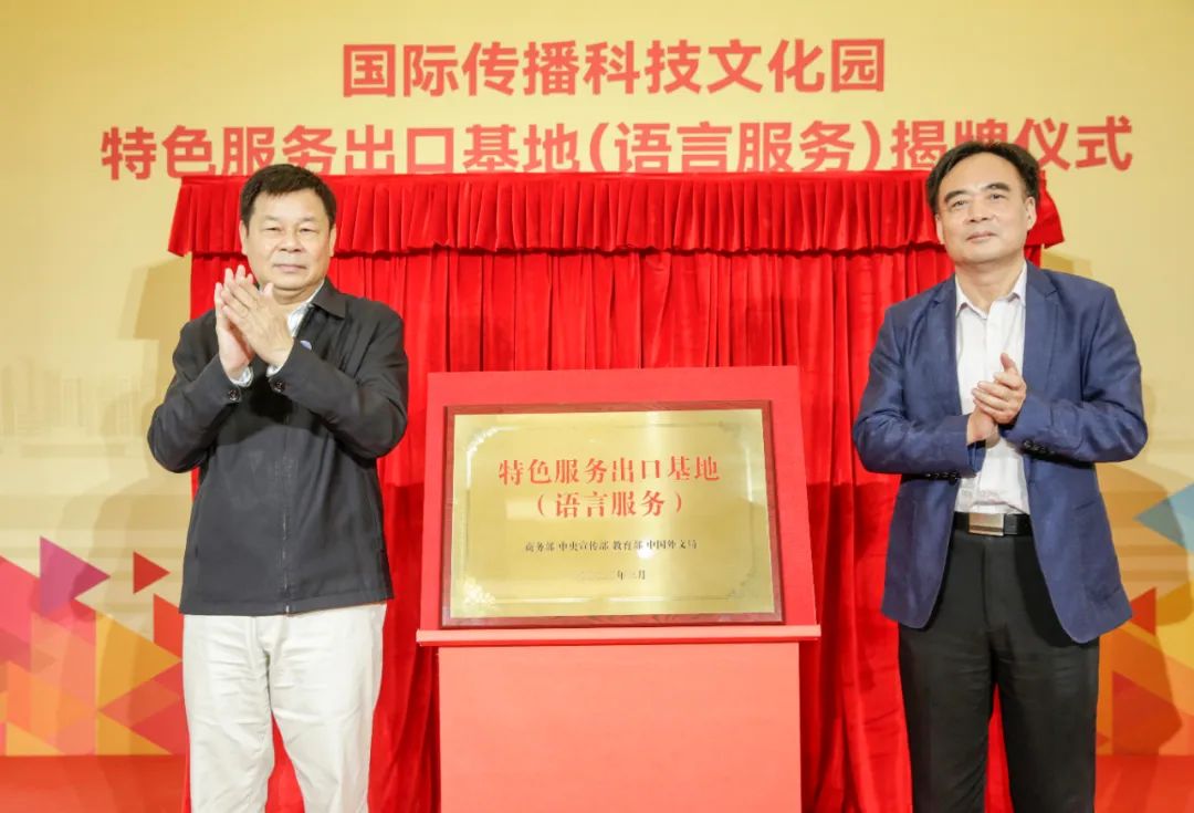 ▲杜占元(左)、陆彩荣(右)为特色服务出口基地(语言服务)揭牌。