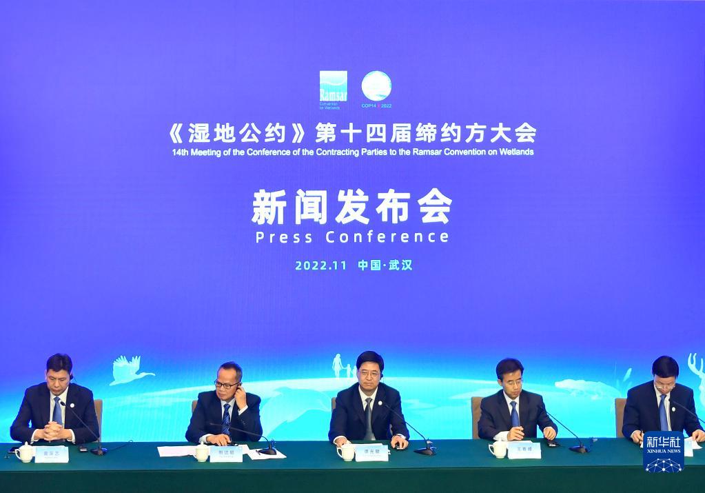 这是11月6日在湖北武汉拍摄的《湿地公约》第十四届缔约方大会新闻发布会现场。新华社记者 孙瑞博 摄