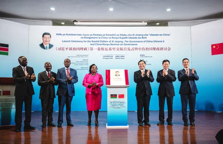 中宣部分管日常工作的副部长、文化和旅游部部长胡和平,中国外文局局长杜占元,中国驻肯尼亚大使周平剑,肯尼亚旅游、野生动物和遗产部长佩尼娜·马隆扎等中肯嘉宾共同为《习近平谈治国理政》第一卷斯瓦希里文版新书揭幕