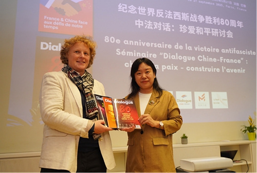 9月27日,纪念反法西斯战争胜利80周年——中法对话:珍爱和平研讨会在法国巴黎举办。中国外文局西欧与非洲传播中心(今日中国杂志社)主任赵丽君、中国驻法国大使馆公使衔参赞王健,法国旺代天主教学院政治学系主任、国际关系学教授马蒂厄·格朗皮龙、法国扎菲尔欧亚合作促进会会长、地缘政治学者让·佩古雷(贝文江),法国和平运动组织副主席伊夫-让·卡拉斯,法国国家科学研究中心研究员、经济学家雷米·赫雷拉,巴黎法中友好协会副主席利亚齐德·本哈米等来自中国和法国的50余位高校、智库、非政府组织和媒体的代表参加本次研讨会。
