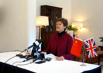 英国驻华大使吴百纳(Barbara Woodward)答记者问。摄影:周琳