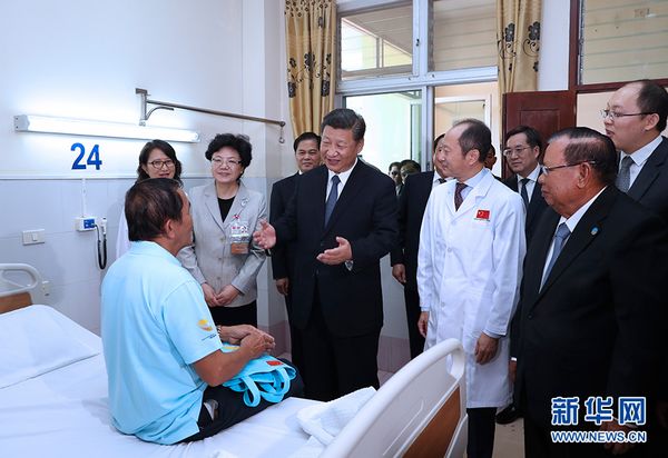 11月14日,中共中央总书记、国家主席习近平同老挝人民革命党中央委员会总书记、国家主席本扬在万象一道出席玛霍索综合医院奠基仪式。奠基仪式后,习近平和本扬共同前往医院住院部大楼,在眼科病房,医护人员现场为接受中方白内障手术治疗后康复的老方病患揭开眼罩,习近平祝愿患者早日康复,家庭幸福。新华社记者 马占成 摄