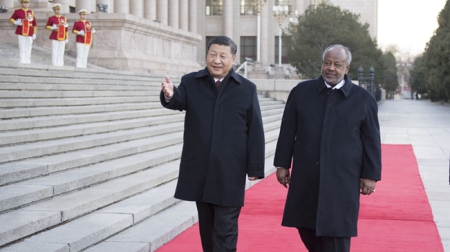 11月23日,国家主席习近平在北京人民大会堂同来华进行国事访问的吉布提总统盖莱举行会谈。这是会谈前,习近平在人民大会堂东门外广场为盖莱举行欢迎仪式。新华社记者 李学仁 摄
