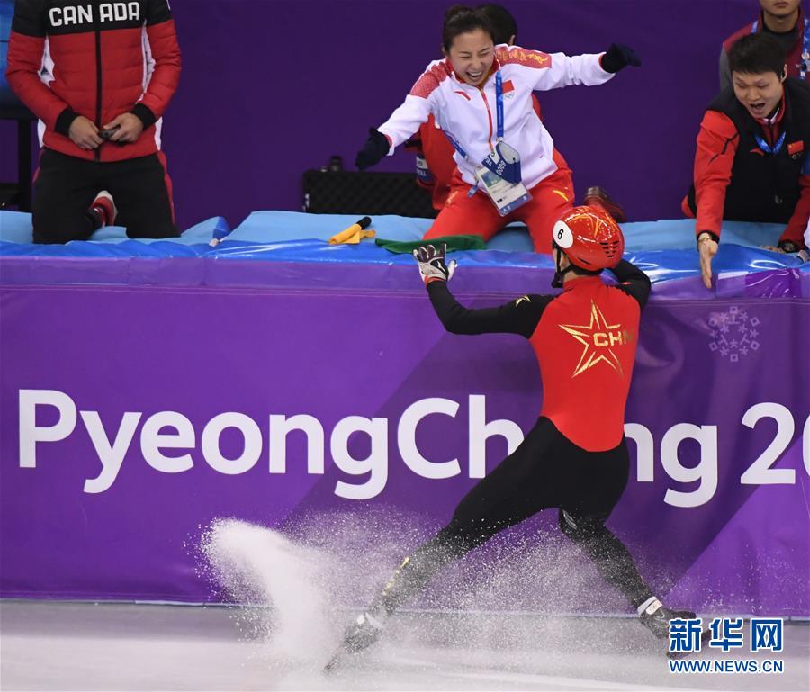 这是2018年2月22日,在平昌冬奥会短道速滑男子500米决赛后,中国滑冰协会主席兼中国短道速滑队主教练李琰(上)与夺冠的中国选手武大靖庆祝。 新华社记者王昊飞摄
