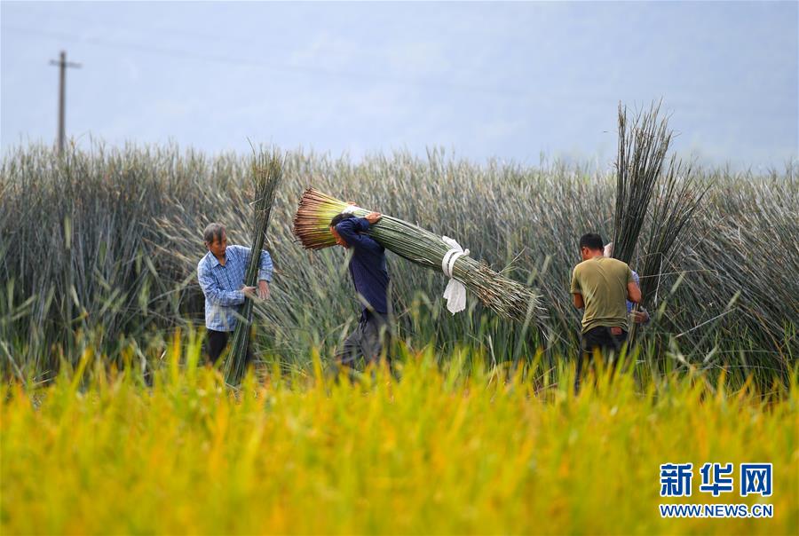 10月7日,六羊屯村民在地里收割蔺草。金秋时节,广西柳州市柳江区百朋镇里团村六羊屯种植的200多亩蔺草迎来丰收,农民抓住晴好天气集中收割、晾晒。据了解,六羊屯农户将晾晒后的蔺草编织成壮族草席,每亩产值近3万元,成为农民脱贫致富的主导产业。新华社发(黎寒池 摄)