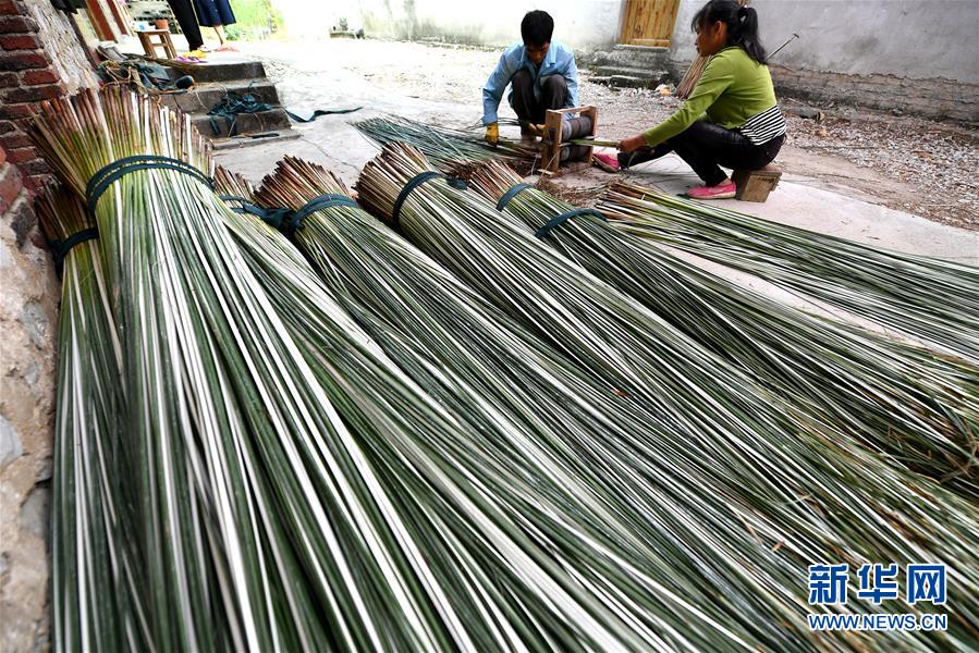 10月7日,六羊屯村民在切割蔺草。金秋时节,广西柳州市柳江区百朋镇里团村六羊屯种植的200多亩蔺草迎来丰收,农民抓住晴好天气集中收割、晾晒。据了解,六羊屯农户将晾晒后的蔺草编织成壮族草席,每亩产值近3万元,成为农民脱贫致富的主导产业。新华社发(黎寒池 摄)