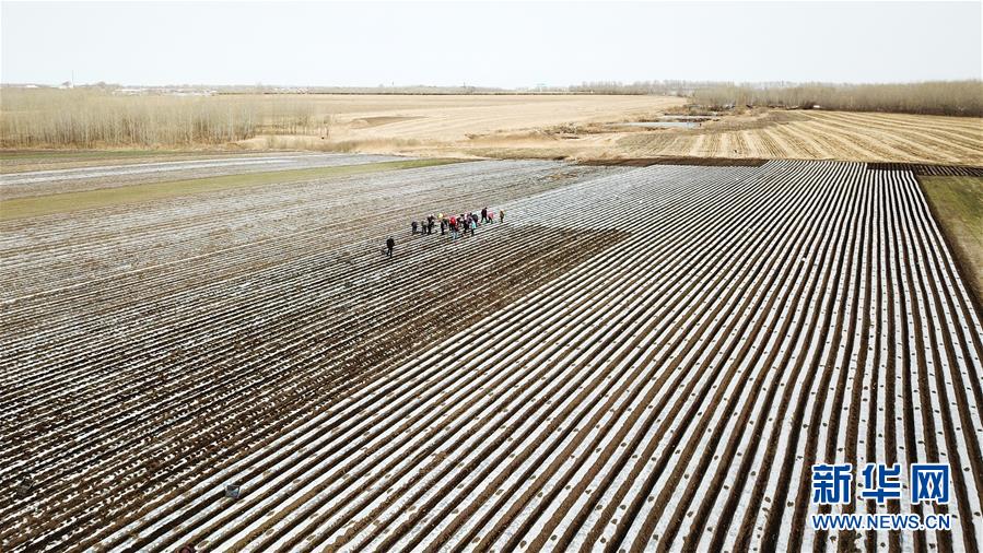 4月14日,向阳村薯菜套复种园区种植户移栽马铃薯(无人机照片)。 近日,黑龙江省兰西县兰西镇向阳村薯菜套复种园区开始移栽马铃薯。覆膜的黑土地呈现出黑白相间的美丽“线条”,种植户在“线条”中种下丰收的希望。该园区套复种主打品种是早春马铃薯和秋白菜,两茬作物平均每亩纯收入约3500元。 新华社记者 王建威 摄