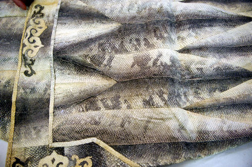 在2010年的上海世博会上,曾展出过一件赫哲族的传统服装,这件在袖口和下摆处点缀着云卷和浪花等吉祥图案的、灰白相间的条纹服装,不是用普通的棉、麻或羊毛等大众所熟悉的材质,而是用一种特殊的“面料”——鱼皮制成。据说制作这件衣服用了50多条十几斤重的大马哈鱼,它的制作人,就是赫哲族鱼皮制作传承人尤文凤。尤文凤说,制作这样一件衣服,不算剥鱼皮、晒鱼皮等工序,仅仅是缝制3个人就用了12天,完全是手工。